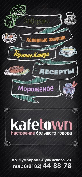 Немного о кафе: Kafetown - уютное место, где вы можете отлично провести время с друзьями и близкими, просто вкусно поесть, выпить чашечку ароматного кофе или отпраздновать свои значимые события. Это отличное место для проведения бизнес встреч и деловых обедов. Меню Kafetown удивит вас широким выбором салатов и закусок, горячих блюда из мяса, рыбы и птицы, супов, кофе, коктейлей, разливного пива и т.д. А также, в будни Kafetown порадует вас завтраками и бизнес-ланчами.