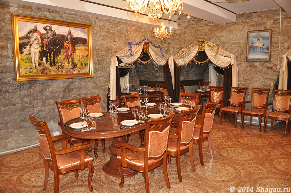 Гостей ресторана приятно удивят мастерство воссоздания атмосферы старины, гостеприимства и доброжелательности персонала, традиционная русская и кавказская кухни. Богатое, интересное и очень разнообразное меню не оставит равнодушным даже изысканного гурмана русской кухни. Одни салаты, например, порадуют вегетарианцев и сторонников здорового образа жизни. Другие салаты способны вышибить слезы восторга из любого тамады! Настоящий тамада, как известно, ест только селедку под шубой.