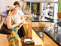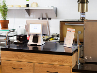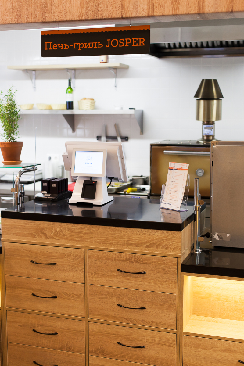 Рабочее место хостесс (оно же и кассовое) оборудовано эквайринговыми терминалами, что позволяет избежать дублирования ввода оплаты банковскими картами. Также оба этих места оборудованы бесконтактными считывателями магнитных карт (процесс получения карты гостя лично у меня занял около 12 секунд). Кроме того, этими считывателями оборудована каждая из 7 станций приготовления блюд и розлива напитков – в качестве рабочих станций выбрали безрамочные моноблоки Штрих с двойным дисплеем, на котором дублируется заказ. Фискальные регистраторы "Пирит" быстро и красиво печатают финальные счета и кассовые чеки (в заведении присутствует огромный ассортимент алкоголя и безалкогольных напитков).