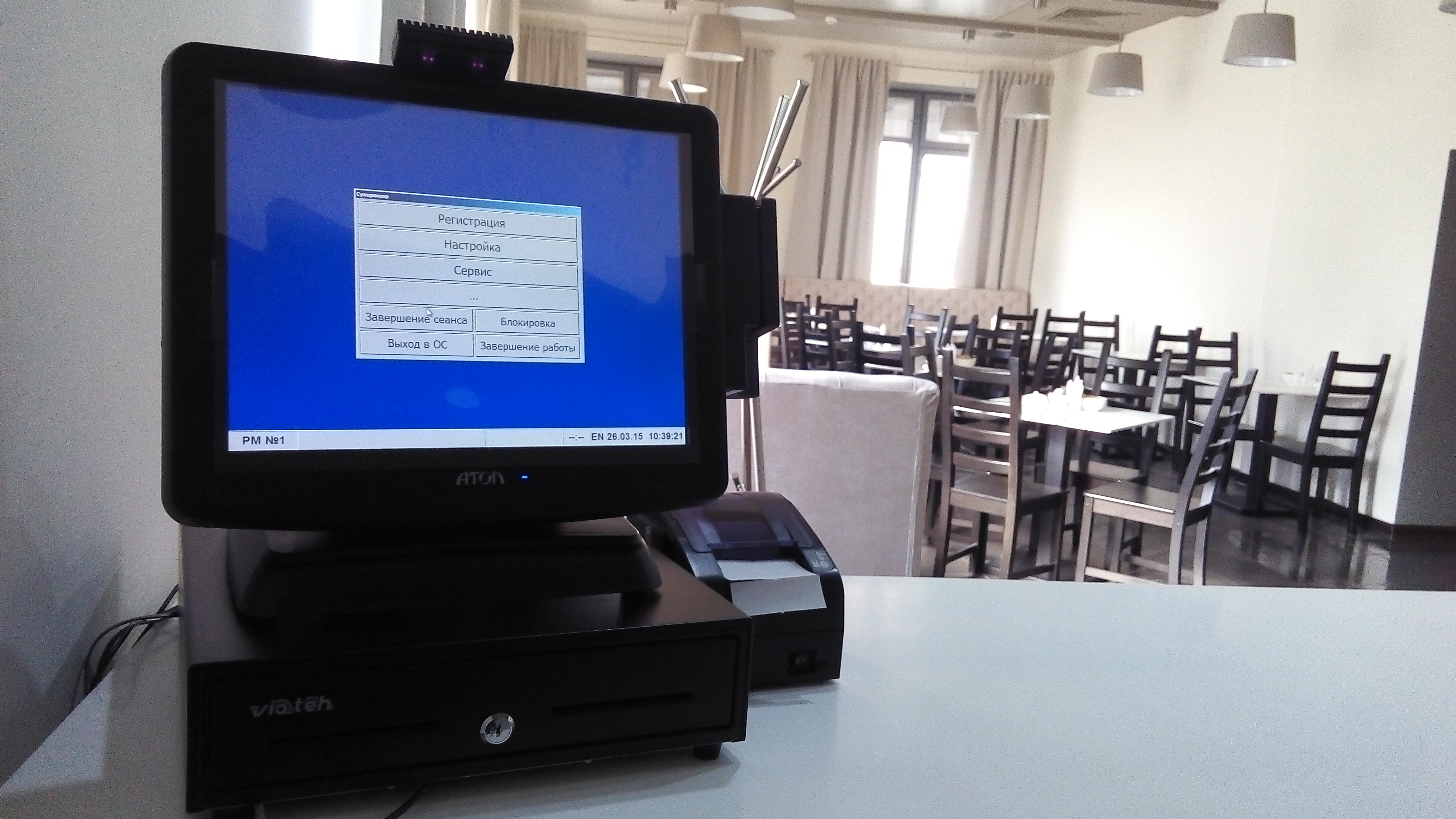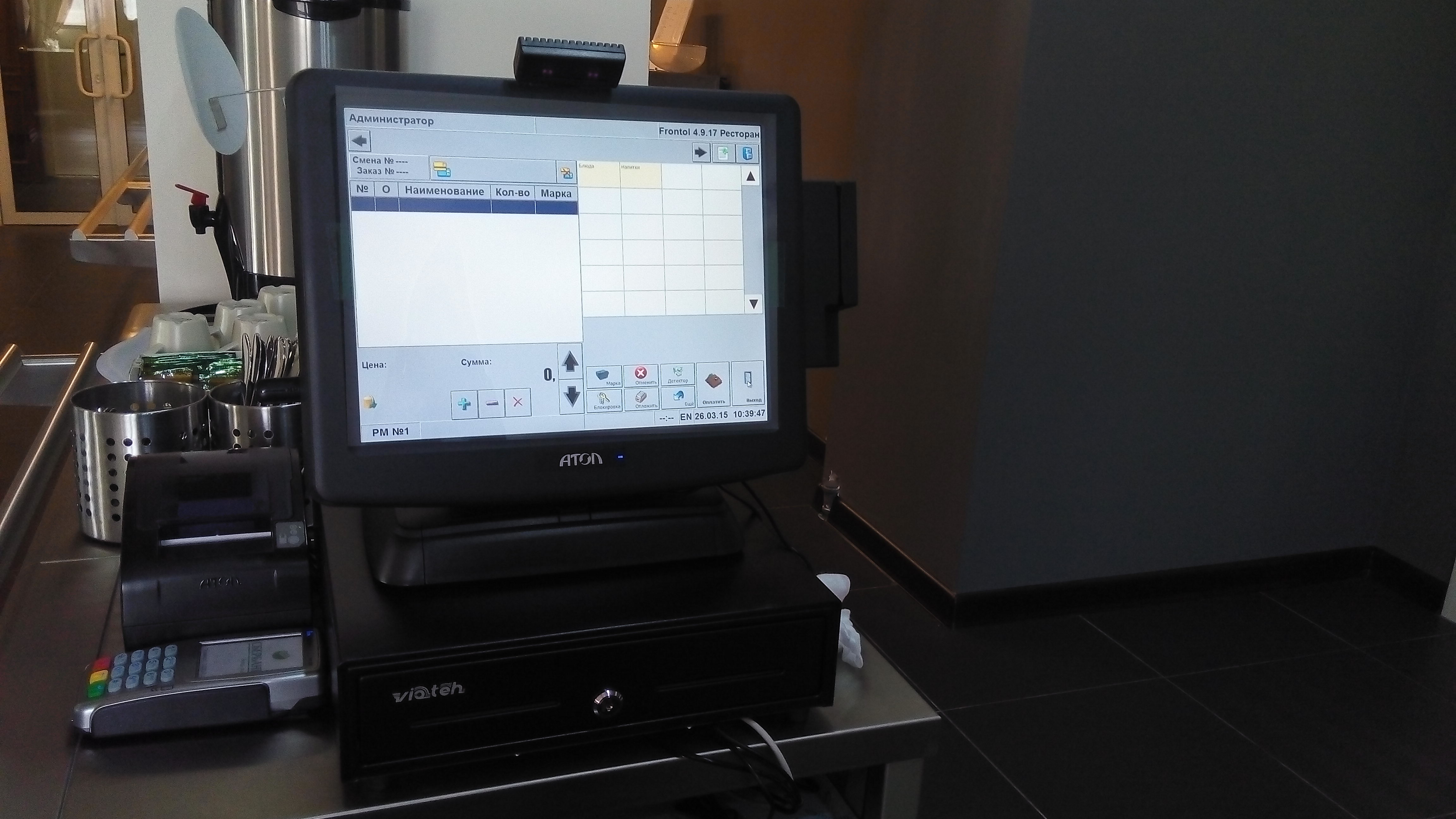В кафе функционируют два кассовых узла: на раздаче и в баре. Для их автоматизации предложены многофункциональные и стильные POS-системы АТОЛ VIVA, отвечающие повышенным требованиям к эргономике, внешнему виду и пропускной способности. В состав каждой POS-системы входит современный фискальный регистратор FPrint-22ПТK, отличающийся информативностью чека, высокой скоростью печати и надежностью.