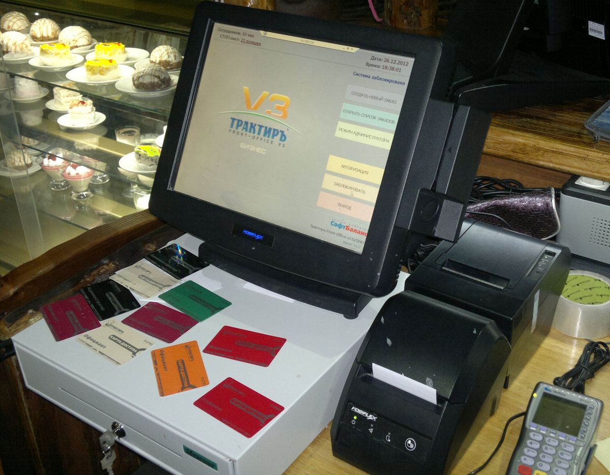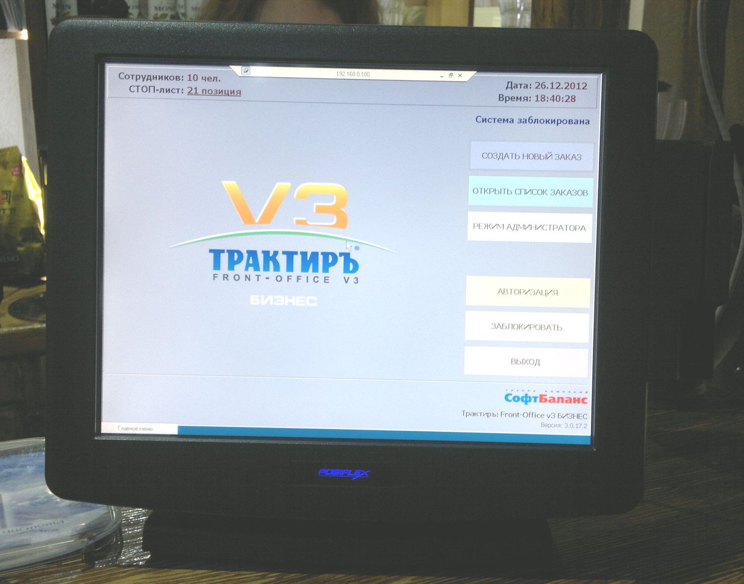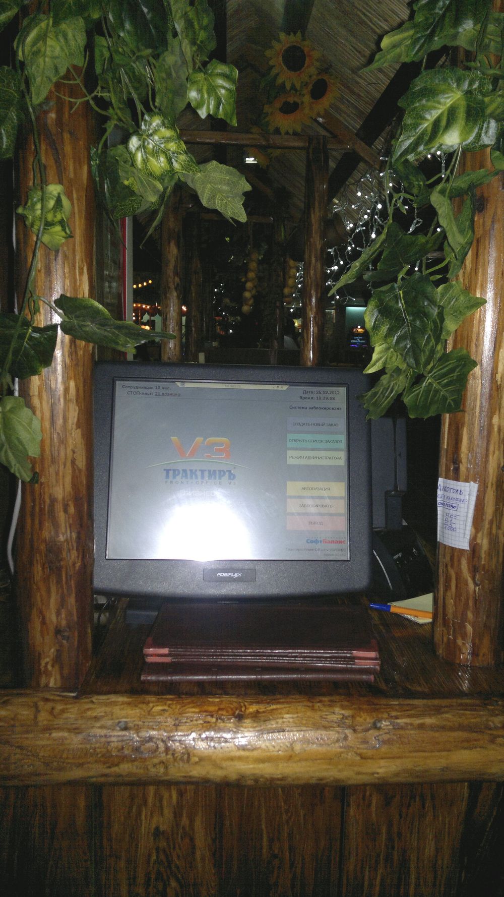 Установлены сенсорные терминал-моноблоки Posiflex KS-6915, чековые принтеры Posiflex Aura-6800 на местах официантов, и Aura-8000 на кухне, фискальный регистратор FPrint-02К. Трактиръ работает на терминальном сервере под управлением Windows Server 2008