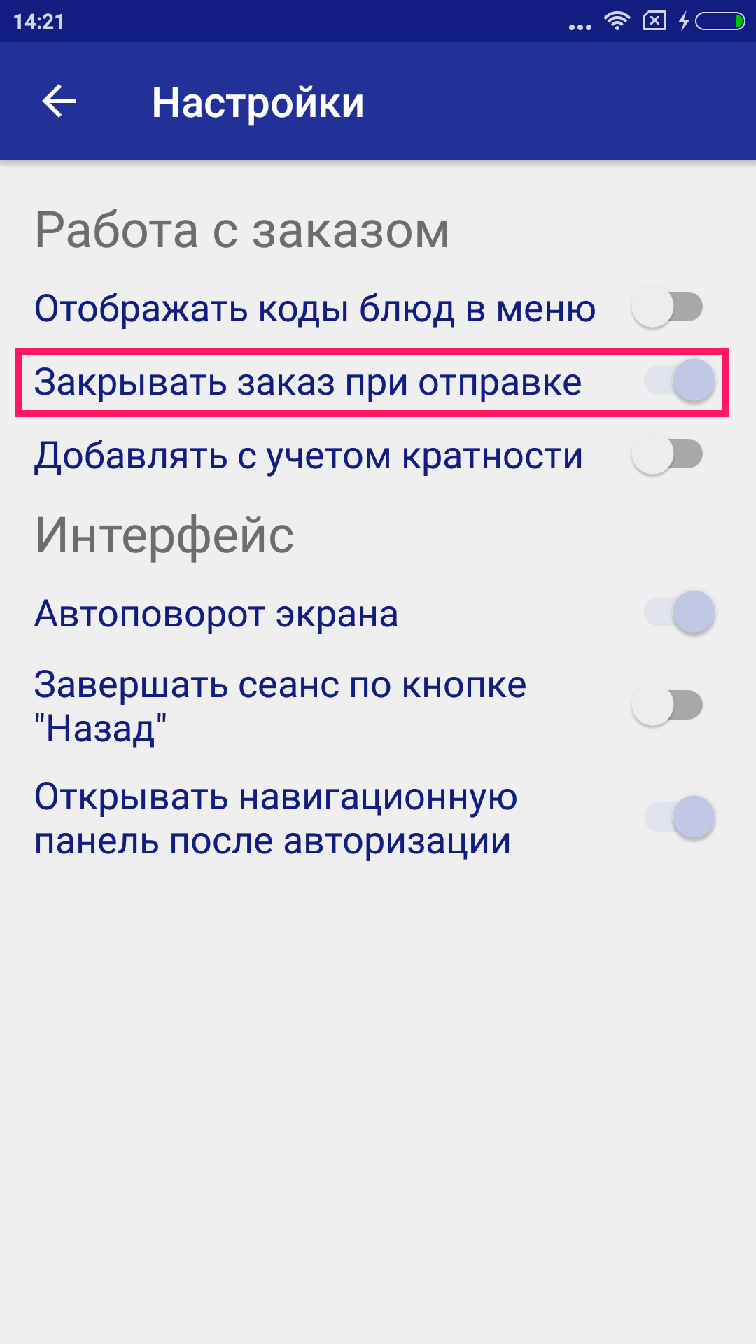 Для этого требуется перейти в меню «Настройки приложения» и поставить переключатель в режим «Выкл.» рядом с полем «Закрывать заказ при отправке».